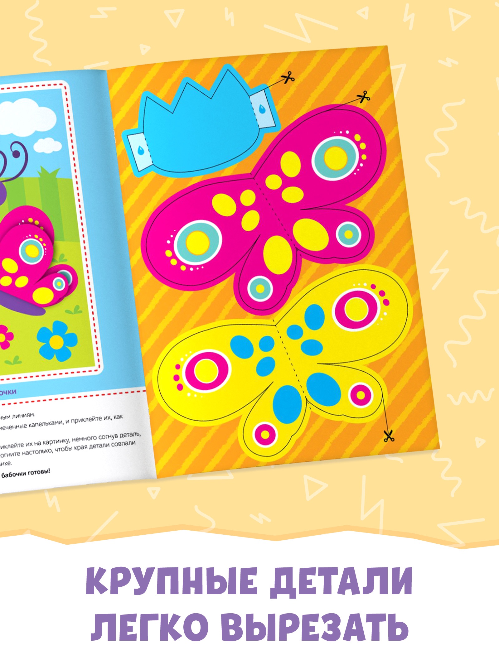 На каждой странице подробно описаны правила создания аппликации. Для работы малышу потребуются ножницы, клей и ваша помощь. Для удобства в книге есть условные обозначения необходимых действий: вырезать, согнуть, завить ножницами, нанести клей.