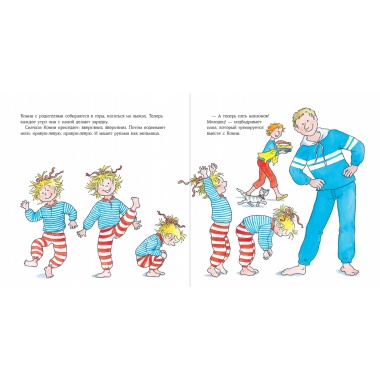 «— А теперь пять наклонов! Молодец! — подбадривает папа, который тренируется вместе с Конни».
