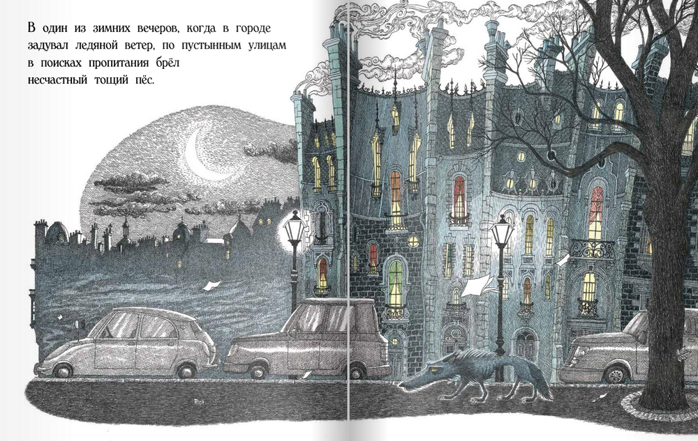 По безлюдным улицам города, продуваемым холодными ветрами, в поисках пропитания и тепла бродит несчастный голодный пёс.