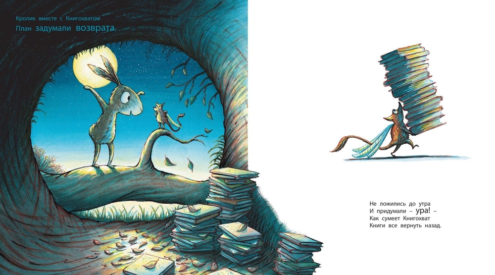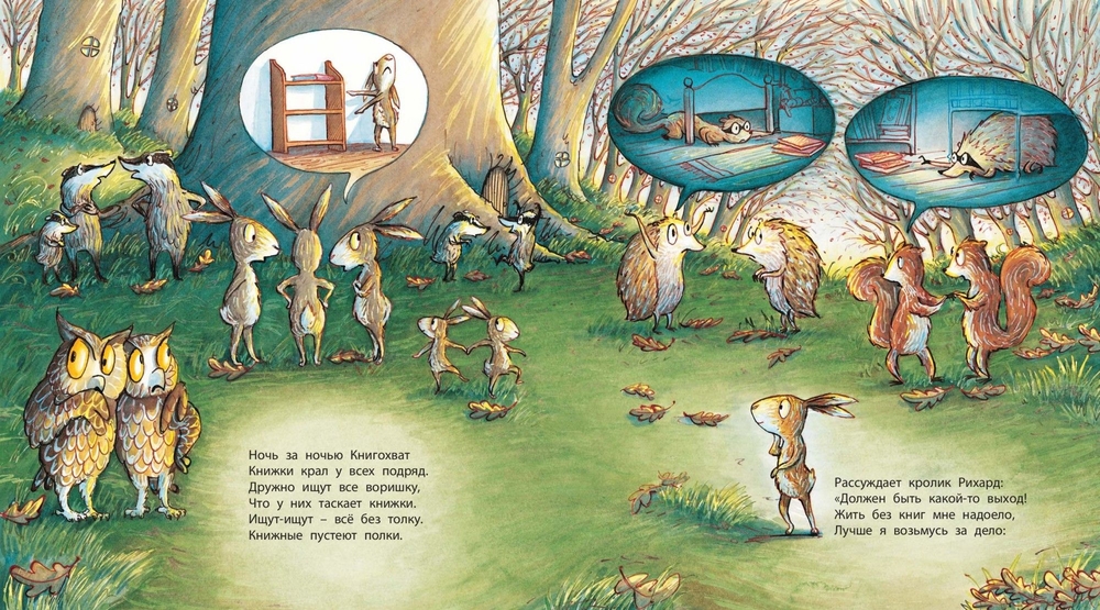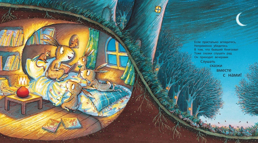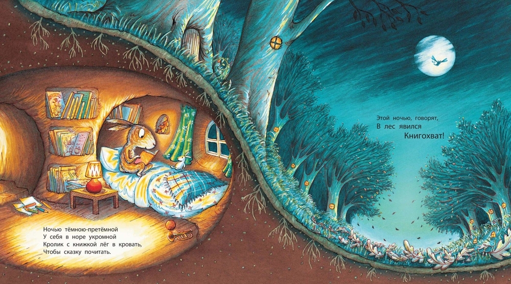 В лесу творятся странные дела: у всех малышей пропадают любимые книжки! Эту загадку берётся разгадать отважный и сообразительный кролик. Тёмной-претёмной ночью он устраивает засаду у книжной полки, чтобы поймать таинственного воришку… Забавная и поучительная история в стихах иллюстрирована яркими, озорными рисунками.