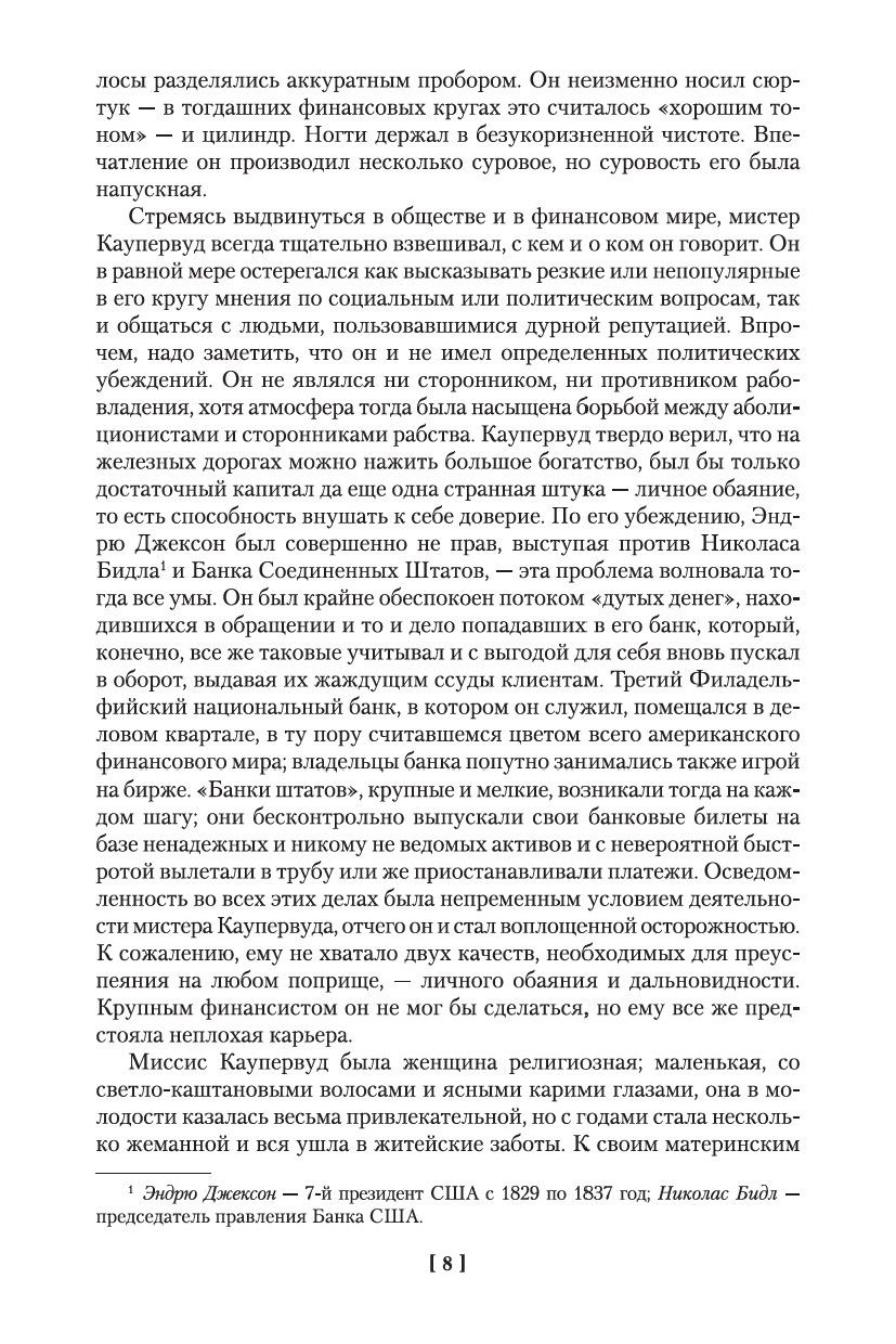 Теодор Драйзер — знаменитый американский писатель и общественный деятель. Его книги, такие как «Американская трагедия», «Сестра Кэрри» и другие, пользовались огромным успехом у читателей во всем мире и до сих пор вызывают самый живой интерес. Одним из центральных произведений Теодора Драйзера стала так называемая «Трилогия желания», рассказывающая о жизни бизнесмена Фрэнка Каупервуда, у которого был прототип в реальной жизни – крупный финансист миллионер Чарльз Йеркс. Написанные в увлекательной манере, романы «Финансист», «Титан» и «Стоик» содержат в себе все необходимые ингредиенты великолепной литературы: психологизм, умело закрученный сюжет, любовные страсти и яркую картину таинственного мира большого бизнеса.