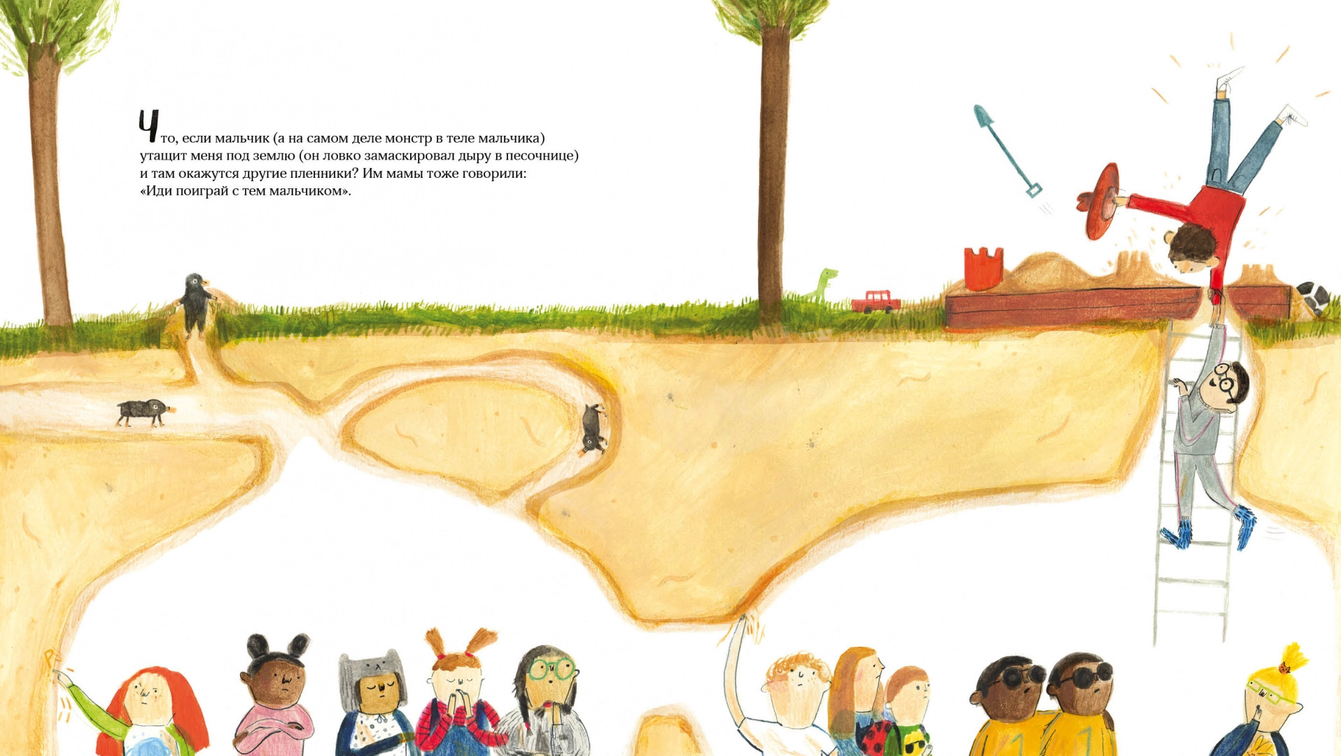 Родители часто с лёгкостью распоряжаются, с кем дружить маленьким детям, не задумываясь, а хочет ли малыш знакомиться, играть вместе, делиться игрушками. Книжка-картинка по-доброму указывает на право ребёнка самостоятельно распоряжаться своим временем на прогулке. Смешные детальные иллюстрации и закрученный сюжет дают заряд вдохновения для фантазёров и сочинителей лет с 4.