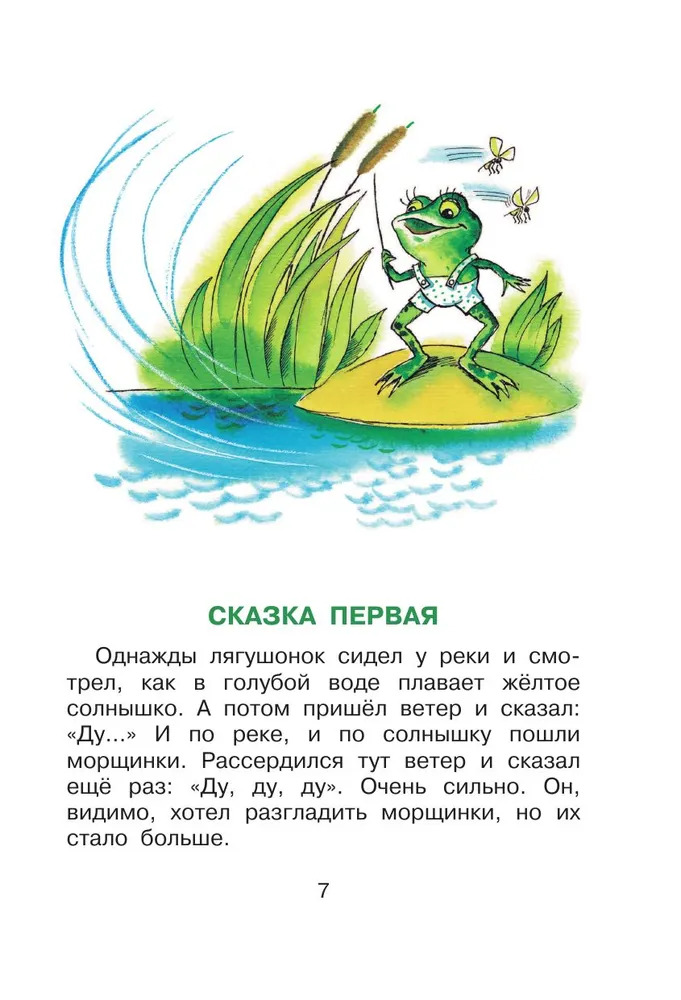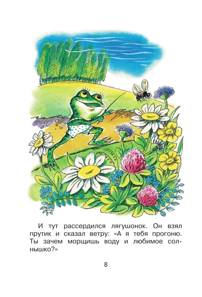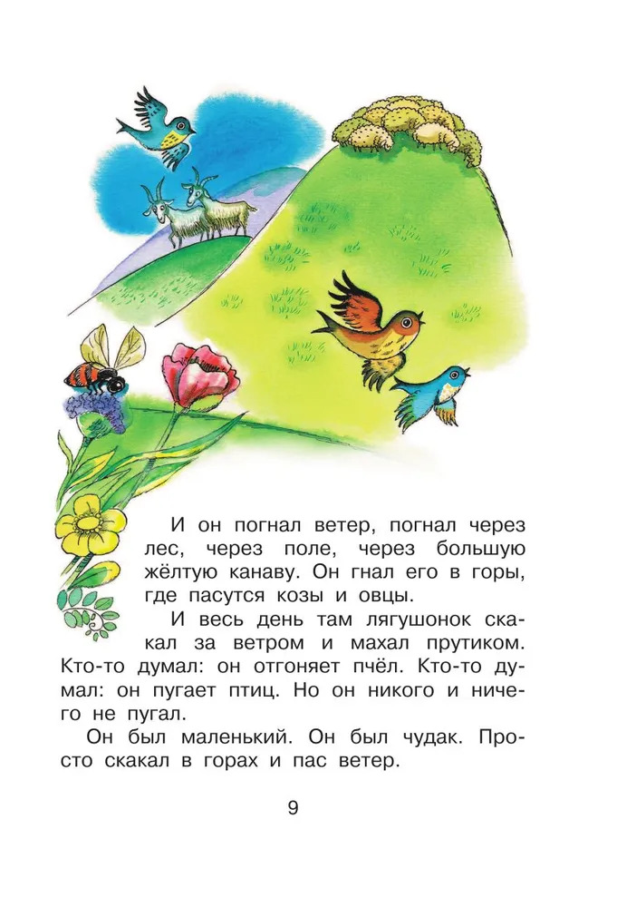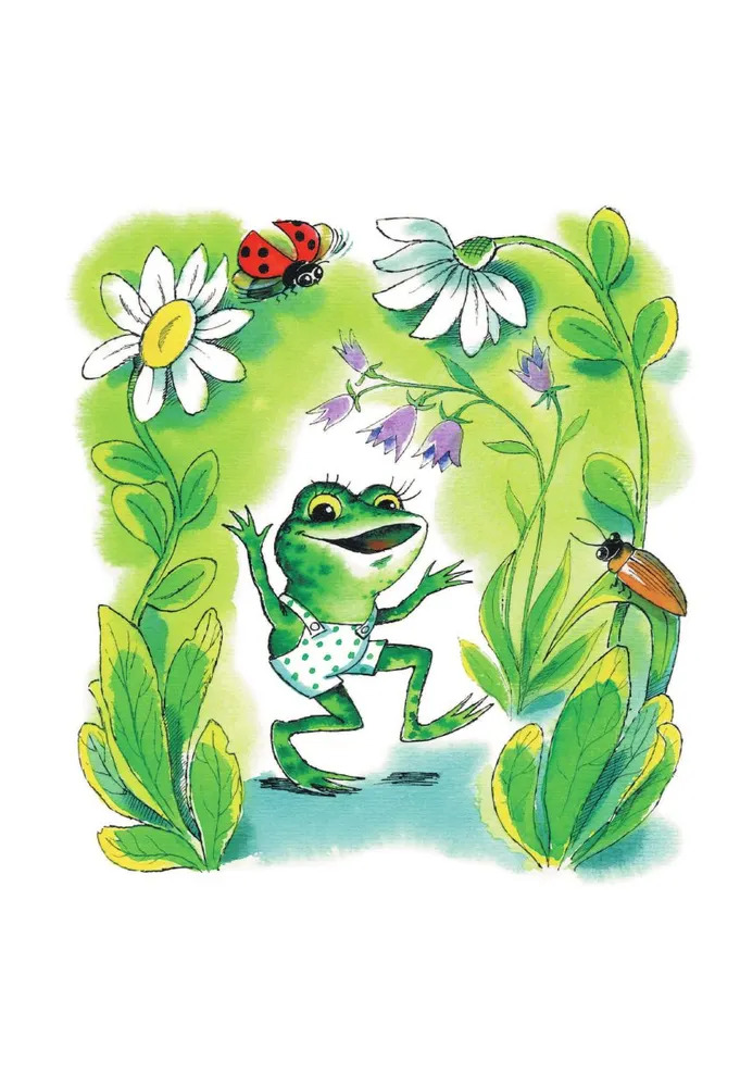 Маленький зелёный лягушонок был большим чудаком. Вместо того чтобы просто скакать по травке и ловить мошек, как это положено лягушатам, он ругался с ветром, задавал необычные вопросы окружающим, дружил с кузнечиком и мечтал найти папу. А ещё он много фантазировал и был очень-очень добрым, прямо как автор этой книги – детский писатель-сказочник Геннадий Цыферов. Все сказки Г. Цыферова – особенные: прочитав однажды, их уже никогда не забудешь. В них совсем нет зла, нет «плохих» героев. Именно поэтому они так нравятся малышам, для которых мир пока тоже состоит из одной только доброты.