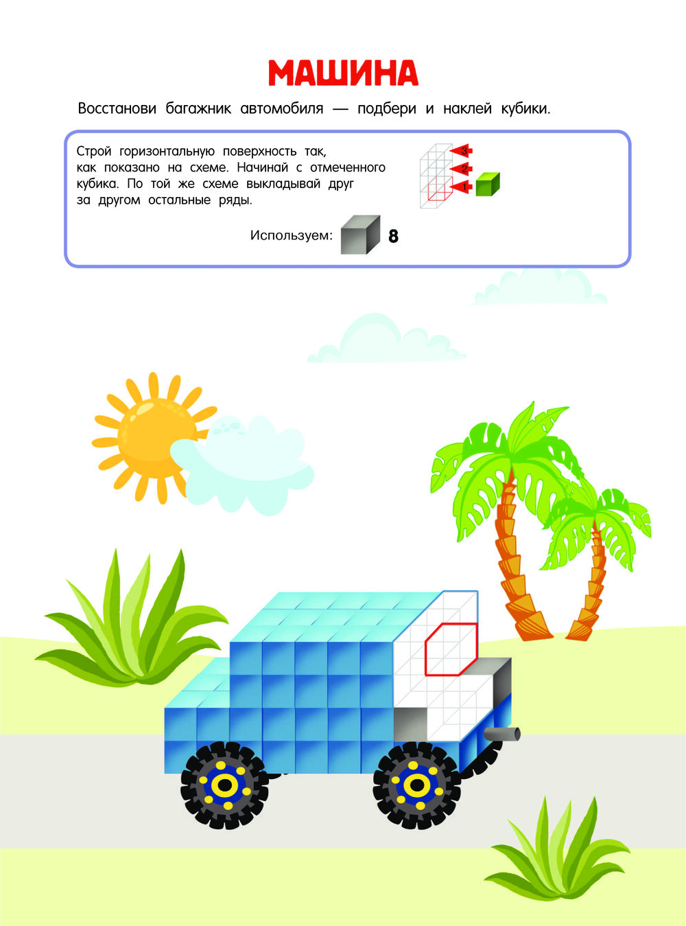 “Креативное мышление” – это развивающая книжка с 3D-наклейками для детей от 5 лет. 3D-стикеры – специальные “кирпичики”, из которых нужно строить различные трёхмерные объекты. Заниматься по книжке не только интересно, но и очень полезно, ведь моделирование объёмных предметов стимулирует пространственное мышление, а игра с наклейками способствует развитию мелкой моторики.