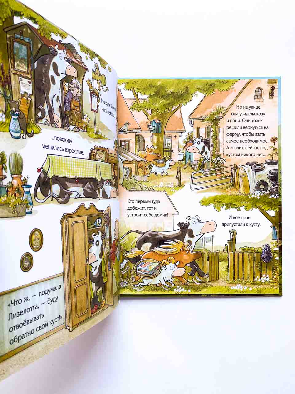 Во время игры в прятки корова Лизелотта случайно видит развесистый куст бузины. Под этим кустом можно устроить себе замечательный домик! Вот только коза и пони тоже давно мечтают об укромном местечке, где можно читать и играть. А куры вообще собираются превратить куст в цирковой шатер. Ну ничего, Лизелотта еще отвоюет свой уютный уголок! Пришло время для коварного плана…
