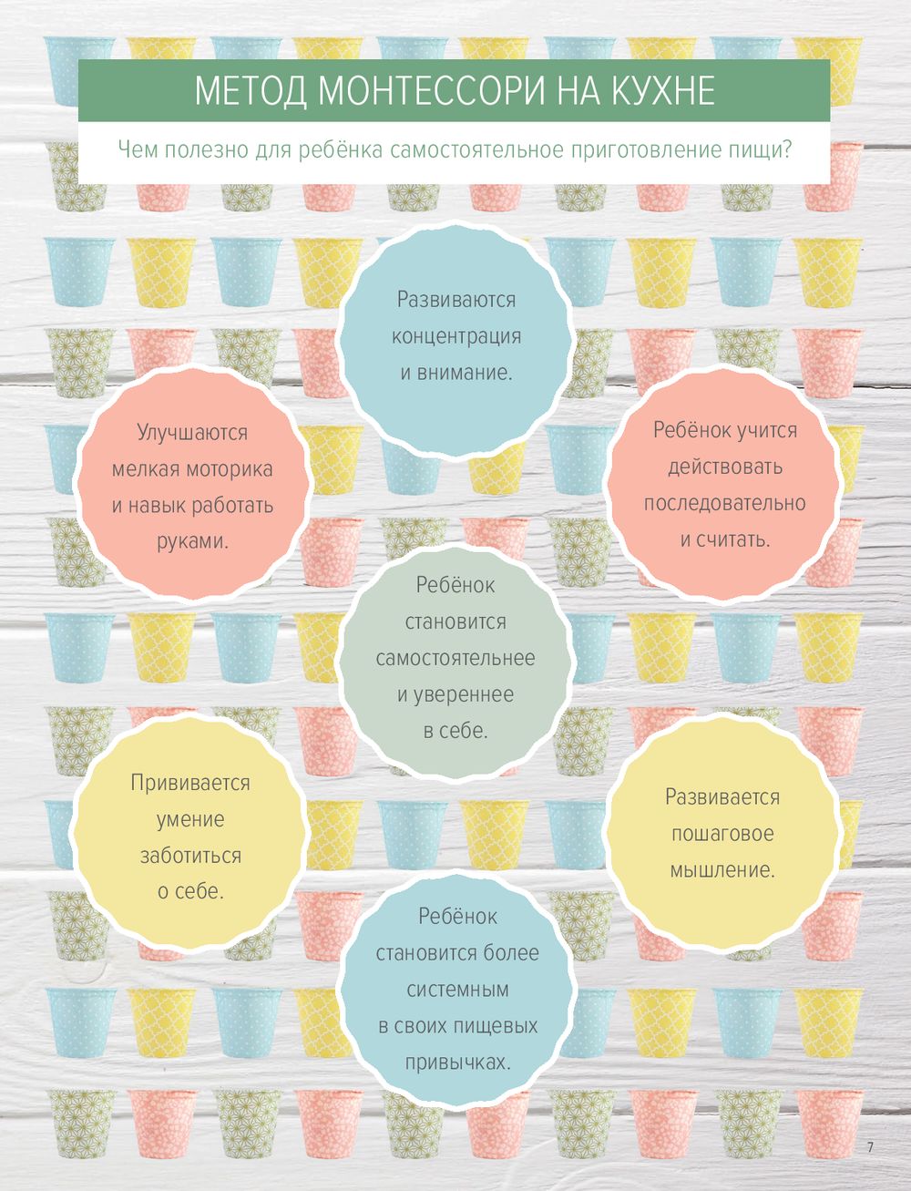 Под обложкой — пошаговые фоторецепты вкусных и полезных десертов, созданных по методике Монтессори. Если ваш малыш еще не умеет читать и считает только до пяти? Этого будет достаточно, чтобы приготовить свои первые блюда.