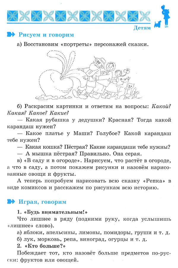 Книга предназначена детям соотечественников, проживающих за рубежом, для домашнего обучения русскому языку. . .В качестве содержательной базы книги выбраны 6 известных русских сказок, так как именно сказки представляют первооснову русской культуры. Методический и дидактический материал адресован русскоговорящим родителям и помогает им организовать занятия русским языком с детьми, живущими в среде другого языка. Материал этого добуквенного учебного пособия помогает организовать неосознанное запоминание звукового строя русской речи, форм русских слов, их значений, культурологического фона. Большинство заданий способствуют формированию языковых и речевых навыков ребёнка.