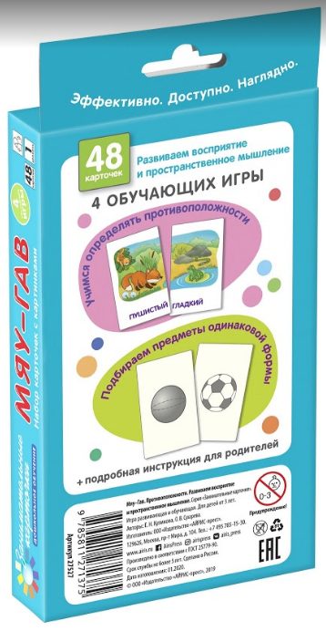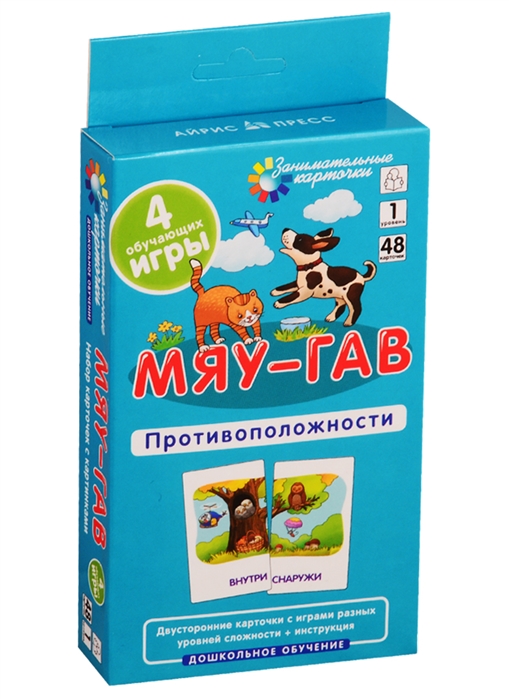 Игры с карточками “Мяу-гав” помогут развить пространственное мышление и восприятие, научат лучше понимать свойства предметов и их положение в окружающей обстановке. Чтобы ребёнок легче усвоил материал, обучение построено на умении различать противоположные понятия: большой – маленький, быстрый – медленный, громкий – тихий и т.п. Рисунки на чёрно-белой стороне карточек знакомят ребёнка с формами предметов. В наборе 48 двусторонних карточек и подробная инструкция с описанием 4 различных игр.
