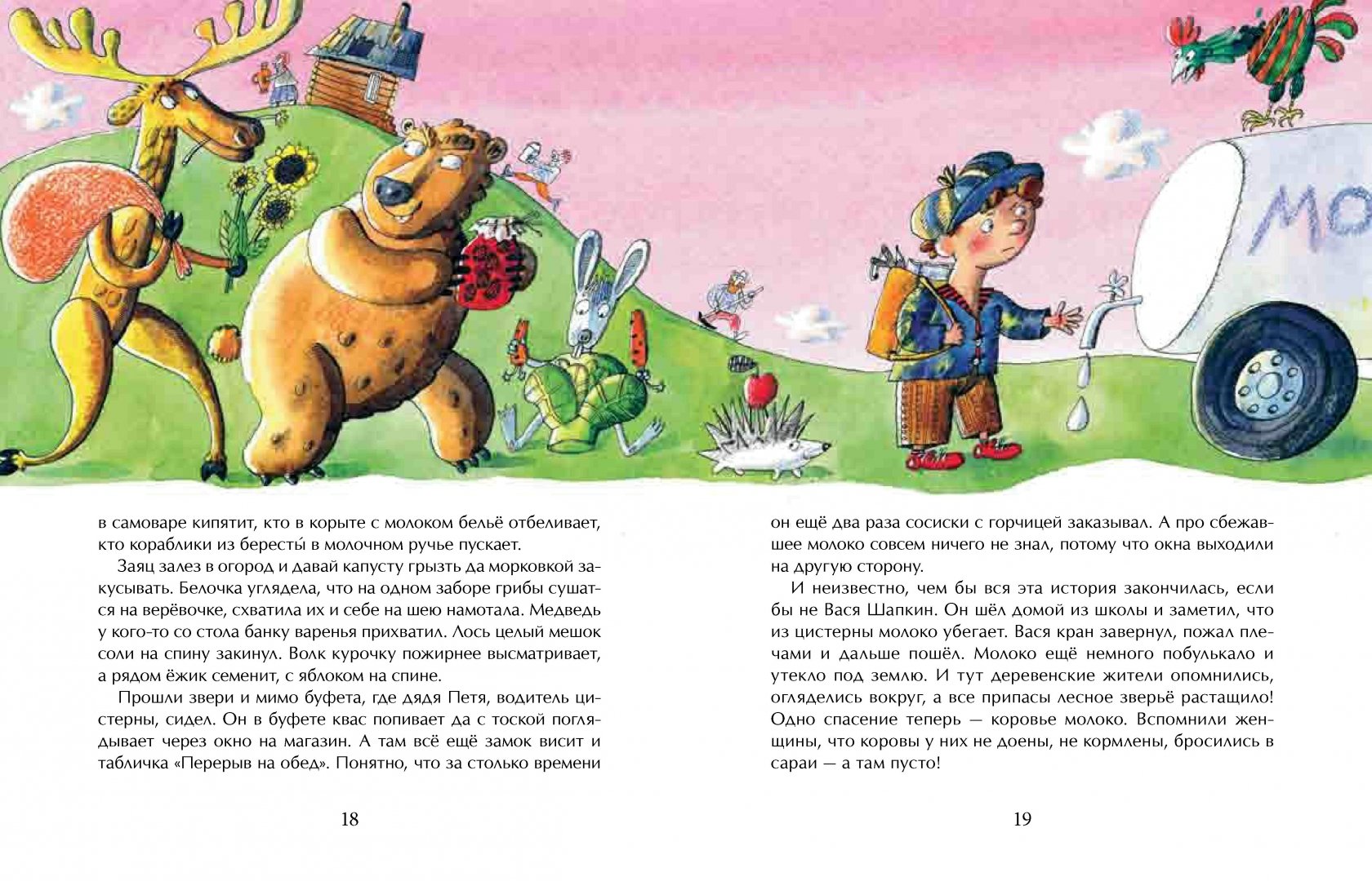 Шофёр дядя Петя привез в деревню цистерну молока… И пошла великая суета, в которую оказались вовлечены сначала коты и деревенские бабы, потом коровы, потом городские жители и лесные звери. Весёлая кутерьма закончилась, только когда школьник Вася Шапкин заметил, что из цистерны убегает молоко, и завернул кран.