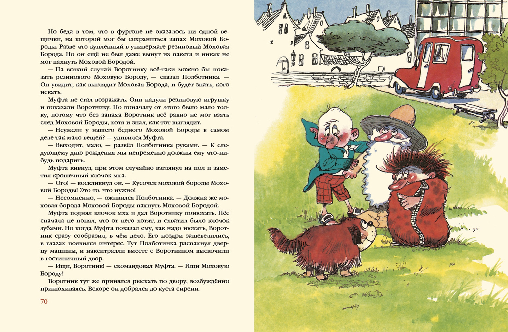 Героями этой сказки являются три маленьких, очень обаятельных и забавных накситралля, похожие на гномов. Муфта и зимой и летом носит вместо обычной одежды толстую муфту на молнии, Полботинка обут в ботинки с обрезанными носами, а у Моховой Бороды борода из самого настоящего мха. Однажды они встретились у киоска с мороженым и после этой встречи уже не расставались, а стали путешествовать вместе. Весёлых друзей ждут невероятные приключения и неожиданные ситуации. Им придётся спасать город от коварных кошек и котов, помогать раненой гадюке и возвращать фамильный медальон его владелице?