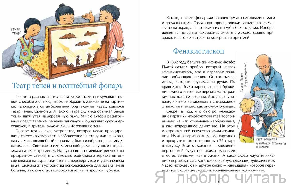 Смотреть мультфильмы любят все. Ведь это похоже на волшебство: нарисованный персонаж вдруг начинает двигаться, говорить, улыбаться… В чём секрет этого искусства, как оно возникло и развивалось, в каких техниках снимают мультфильмы сейчас и как сделать свой собственный мультик в домашних условиях, рассказано в этой книжке, открывающей читателю увлекательный и разнообразный мир анимации.