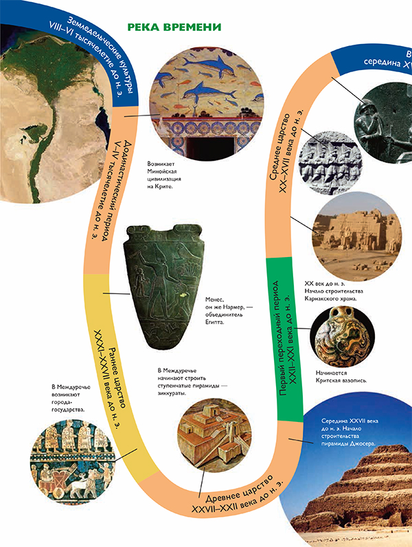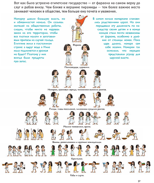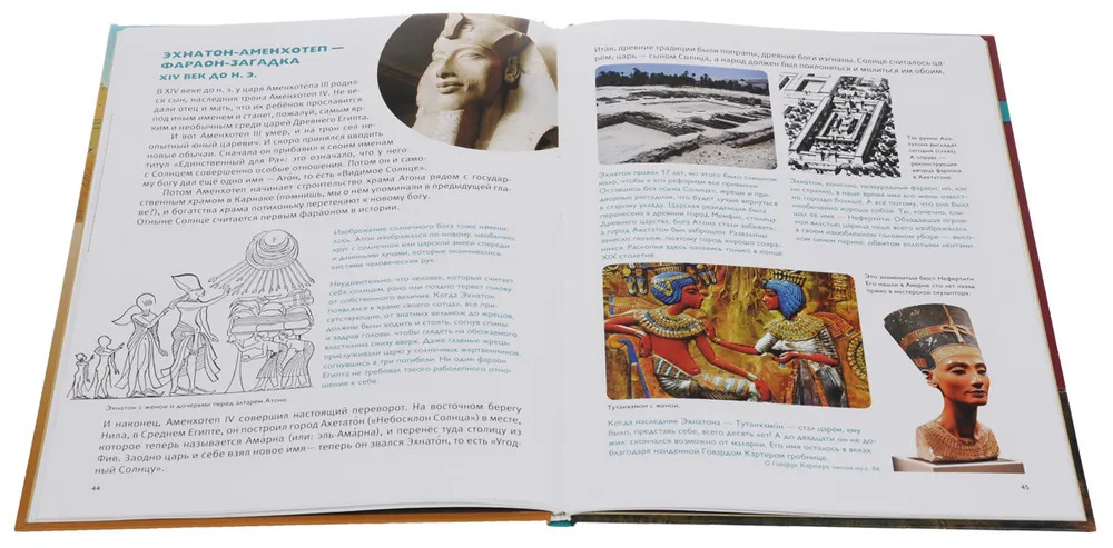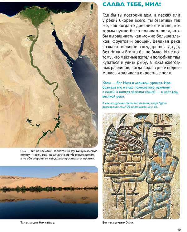 В Египет сейчас поехать просто: сел на самолет – и через несколько часов перед тобой море, пирамиды и верблюды. А хочешь оказаться в Древнем Египте? Его цивилизация просуществовала более 40 столетий и оставила огромное наследие. Учёные смогли расшифровать египетские иероглифы и узнать, как строились гигантские пирамиды. Никаких верблюдов, представь, в Древнем Египте ещё не было. И если бы ты жил в Древнем Египте, под властью фараона, ты бы учился в “доме жизни”, носил парик, писал тростниковым пером на папирусе, играл бы в сенет, а не в домино, и ел бы руками! Интересно? Тогда вперед, в историю: бери скорее нашу энциклопедию с полки, читай, рассматривай иллюстрации и делись новыми знаниями и наблюдениями!