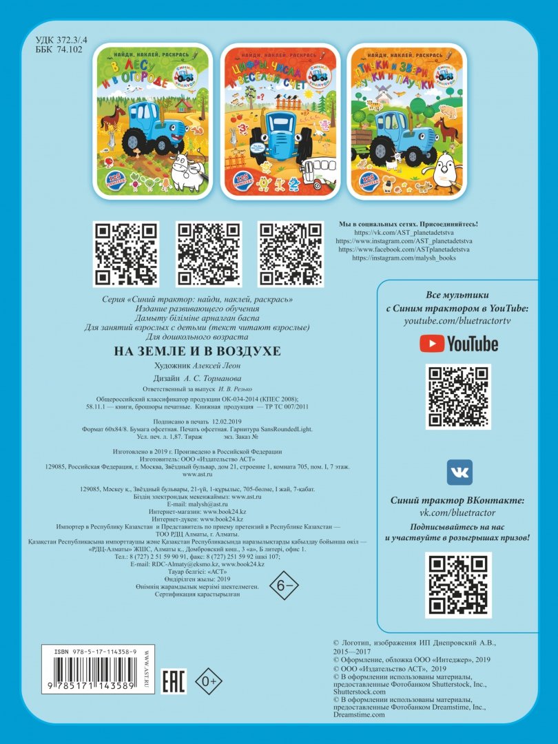 Синий трактор – известный персонаж развивающего мультпроекта, собравшего миллионы просмотров и подписчиков в сети Интернет. На страницах книги “На земле и в воздухе” малыши отправятся в увлекательное путешествие с героями полюбившихся мультфильмов, поиграют с наклейками, выполнят занимательные задания. А ещё здесь есть раскраски, которые нравятся абсолютно всем детям.