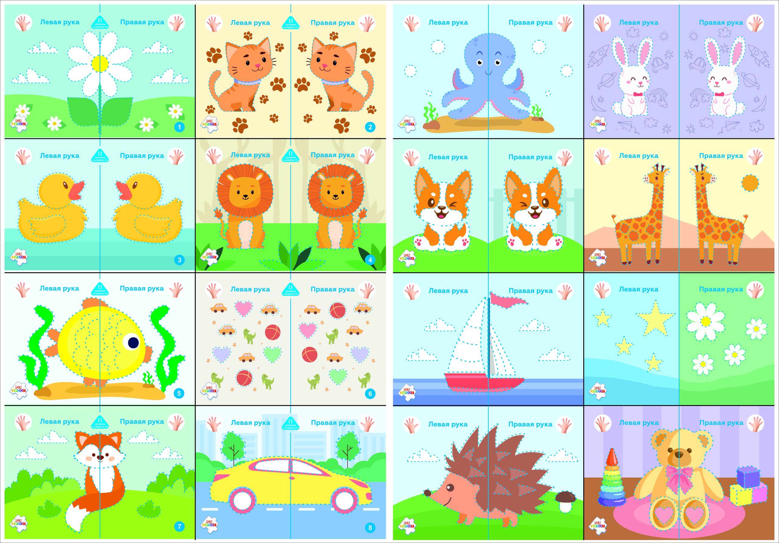 1. Игра “Умелые ручки”. Предложите ребенку устроить соревнование для обеих рук: какая рука умело справится с заданием? Для этого возьмите два карандаша (маркера) и предложите ребенку нарисовать на листе бумаги, например, две точки (вертикальные полоски, ломаные линии) одновременно двумя руками. Всегда следите за тем, чтобы движения обеих рук ребенка при выполнении задания были только одновременными, а не последовательными (сначала одной рукой, а потом другой)! Попросите ребенка потренироваться до тех пор, когда обе руки будут уверенно держать карандаш. После этого можно переходить к рисованию элементов на карточках.