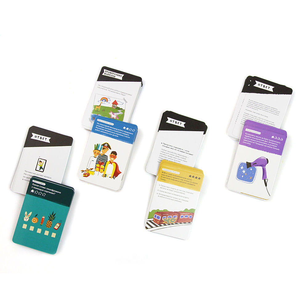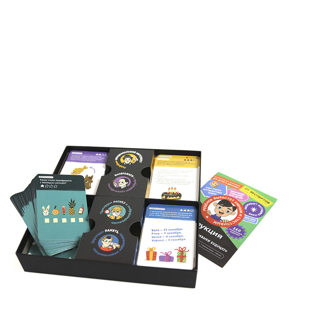 Играйте всей семьёй и раскрывайте потенциал юного гения! Задания рассчитаны на детей от 6 лет, но решать их будет интересно даже взрослым. В комплекте 160 ярких карточек с заданиями, иллюстрированные правила.