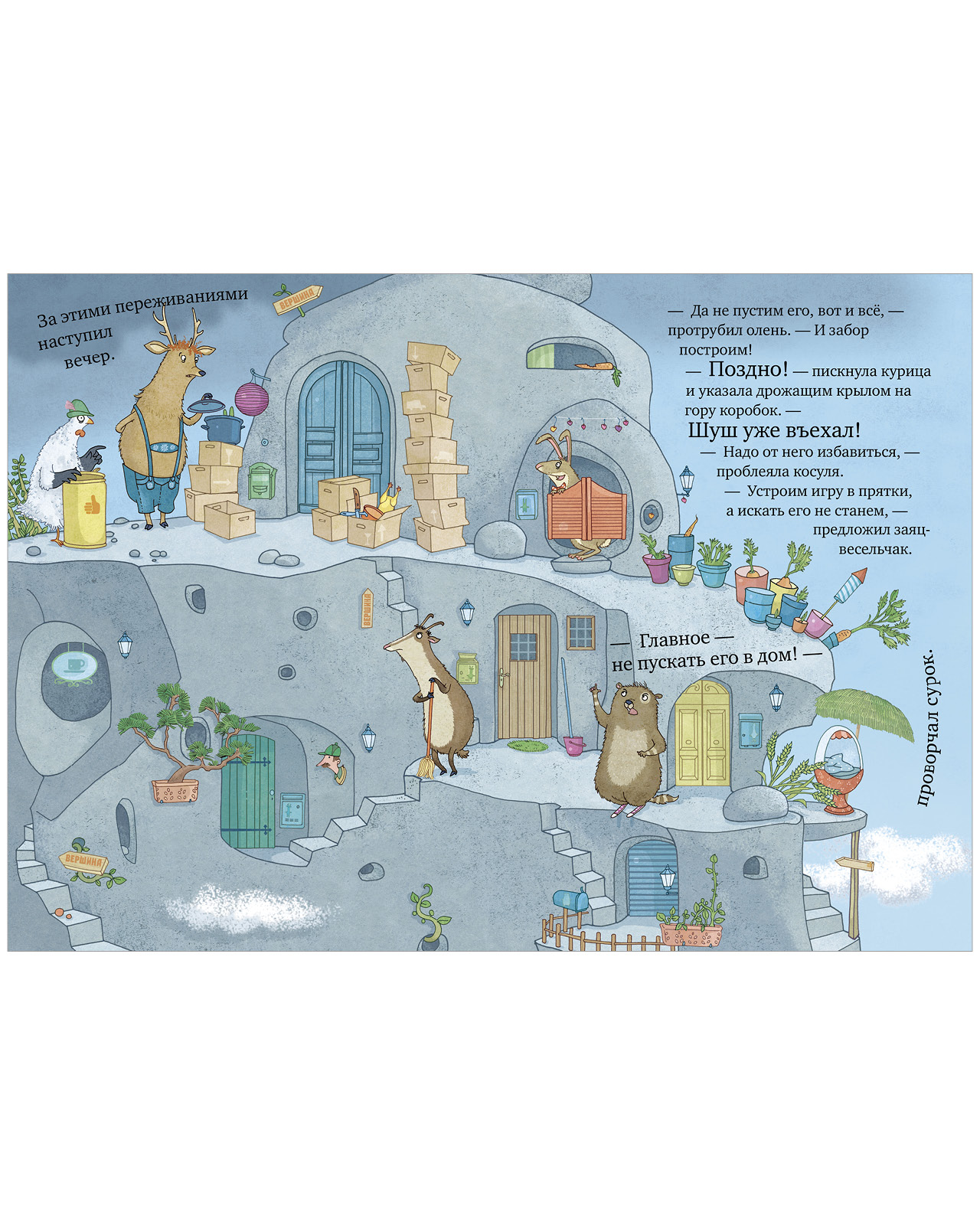 В этой книге потрясающий юмор, который будет понятен и детям, и взрослым. Персонажи очень характерные и яркие. Пожалуй, каждый сможет найти среди своих друзей и знакомых трусливую курицу, упрямого оленя и дерзкую косулю, ворчливого сурка, зайца-весельчака и даже Шуша!