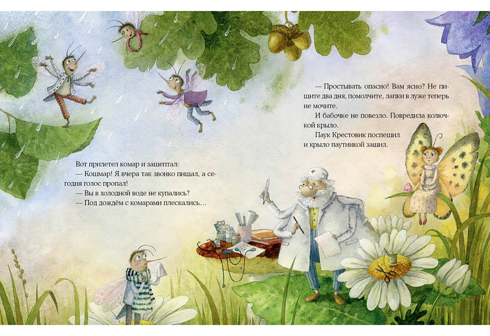 Герой этой замечательной истории – учёный паук. Он открыл свою ПАУКлинику на лесной поляне и всех-всех-всех зовёт на приём. Вот только букашки и жучки боятся идти лечиться к пауку! Но однажды у маленькой мушки разболелось мохнатое брюшко – и как она ни боялась, как ни сопротивлялась, а к доктору лететь пришлось.