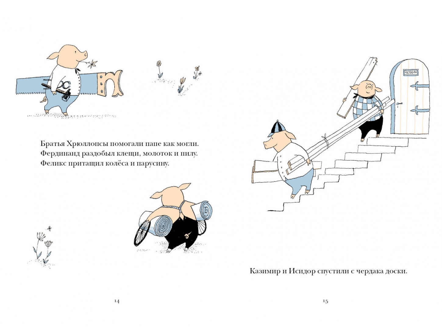 Истории про семью неугомонных искателей приключений, свинок по фамилии Хрюллопс, появились в США в 1957 году. С Хрюллопсов началась карьера эльзасца Томи Унгерера, ставшего впоследствии одним из самых знаменитых иллюстраторов XX века, лауреатом премии Андерсена и автором более 140 детских книг – причем в 30 из них он автор не только иллюстраций, но и текста!