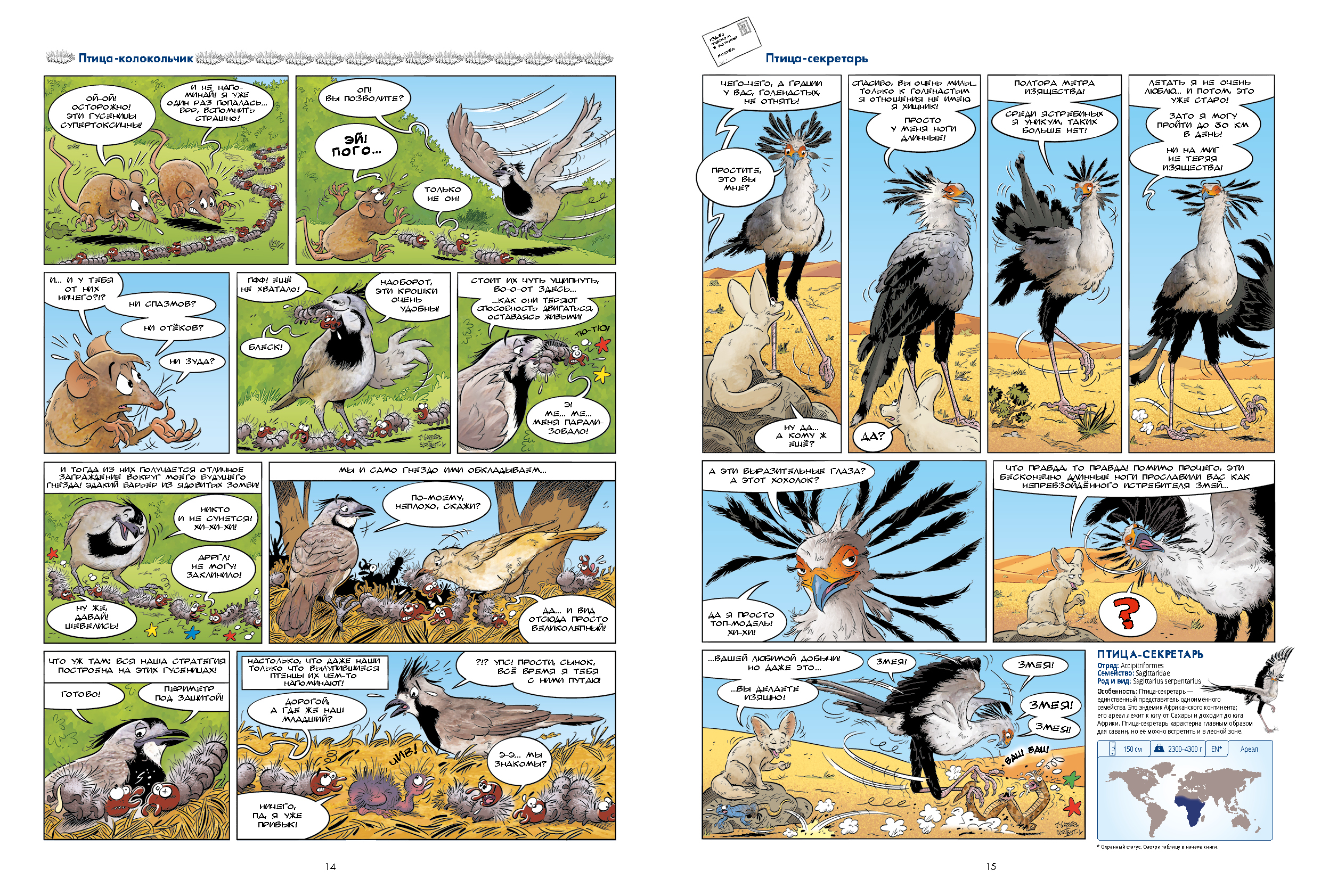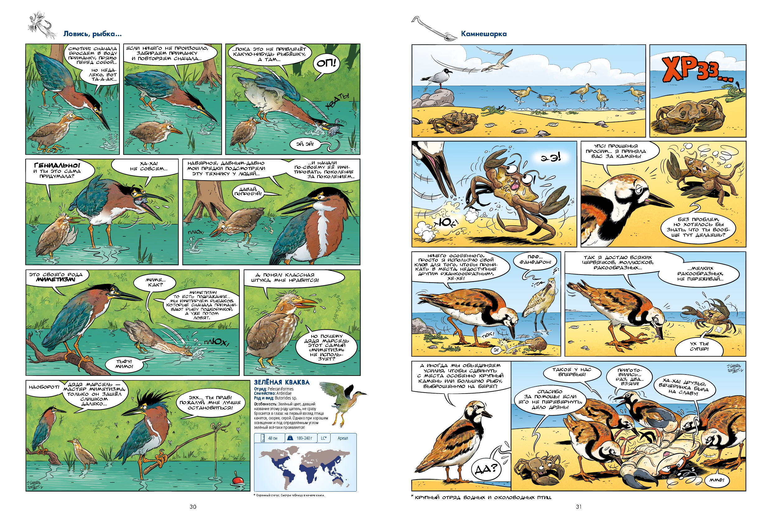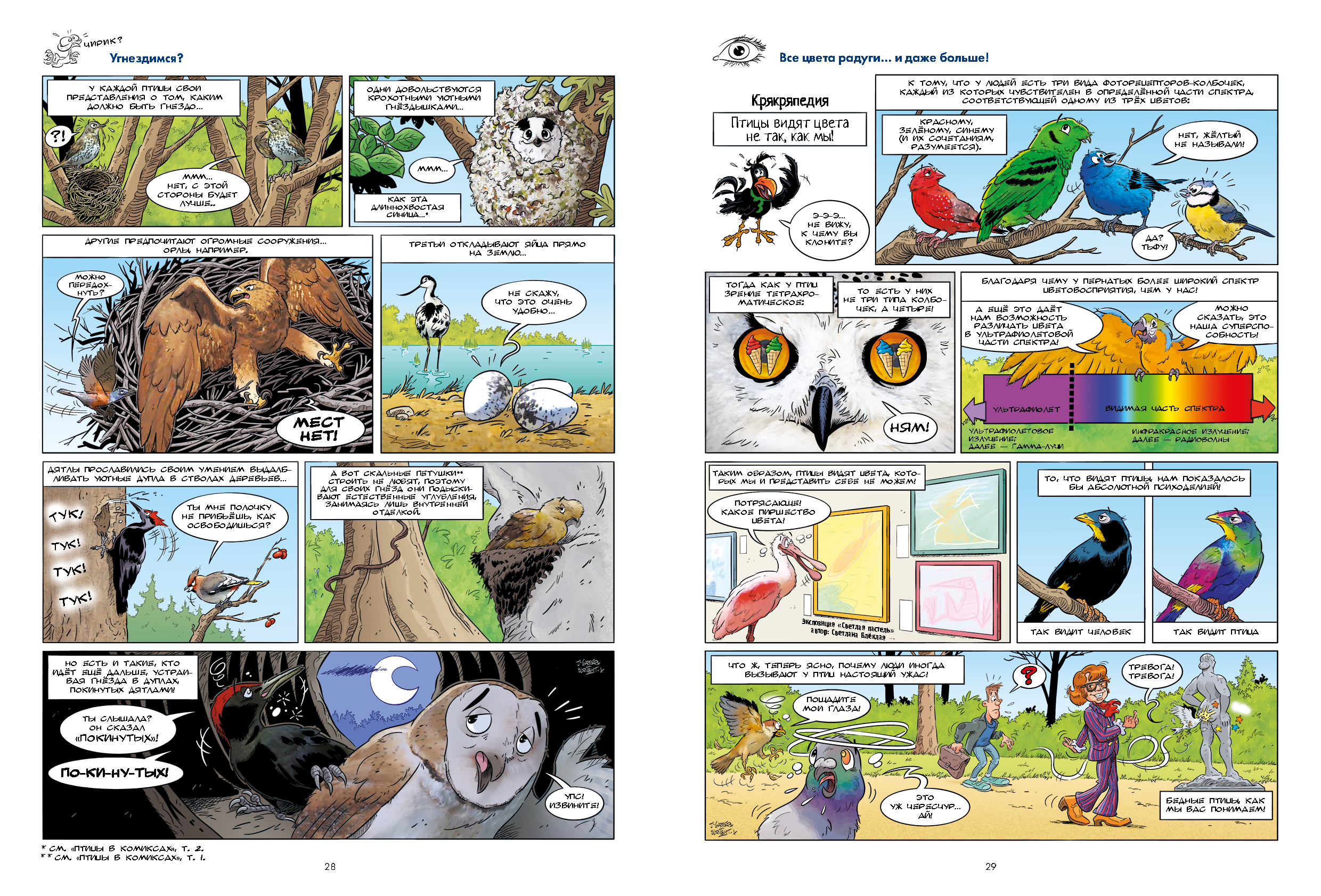 Казалось бы, после двух томов удивительных, а порой и вовсе невероятных историй про птиц, нас, читателей французской серии “Птицы в комиксах”, уже ничем не проймёшь, однако её авторы Жан-Люк Гаррера и Ален Сирван не теряли времени зря и выпустили 3-й том, полный не менее любопытных фактов. Могли бы вы, к примеру, представить, что австралийская птица-колокольчик использует ядовитых гусениц в качестве защитного барьера от врагов?.. А что некоторые буревестники живут более 60 лет, сохраняя способность приносить потомство?.. Или, может, вы краем уха слышали, что грачи обожают принимать “муравьиные” ванны, дрозды борются с хищными птицами методом “группового помётометания”, а зелёная цапля подсмотрела кое-какие рыболовные приёмы у человека?.. Нет?.. Тогда открывайте скорей эту книгу, в которой вы обнаружите не только целую россыпь весёлых и познавательных мини-историй о пернатых, но и подробную обучающую тетрадь с рассказом о таком важном периоде в жизни перелётных птиц, как миграция.