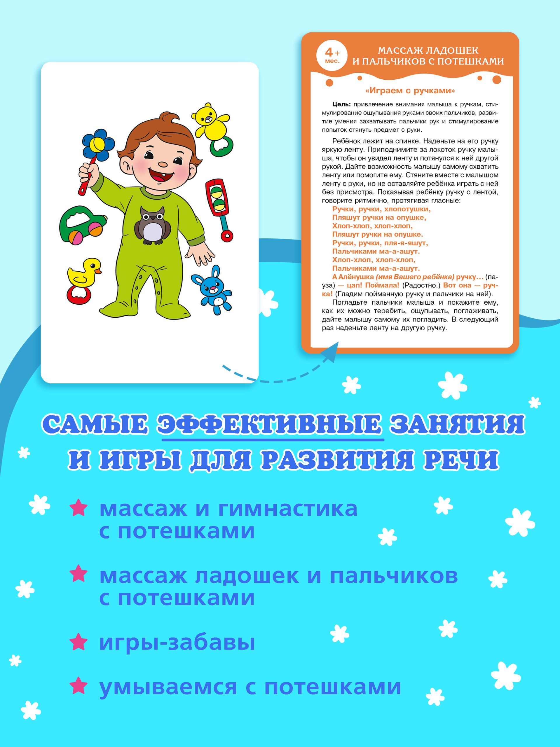 Традиционно в русской культуре потешки служат не только для развлечения, но и для развития детей с самого раннего возраста. Набор карточек “Учусь говорить. С потешками” — это не просто сборник потешек, коротких стишков и песенок. Это авторская методика занятий с ребёнком уже с рождения, которая будет способствовать развитию речи малыша, а также физическому и социальному развитию. На каждой карточке обозначен возраст ребёнка, в котором обозначенное занятие будет наиболее эффективно, приведён текст потешки с подробной инструкцией, а на обратной стороне содержится картинка — иллюстрация к потешке или к занятию. Все картинки приводятся с учётом возрастных особенностей ребёнка. С их помощью ребёнок со временем научится различать цвета, размеры и формы, познакомится с предметами окружающего мира и животными. Карточки с потешками помогут взрослому приучить ребёнка к купанию и соблюдению гигиены, правильно подготовить малыша ко сну вечером и мягко пробудить утром, развлечь малыша и наладить с ним эмоциональный контакт. Некоторые потешки предполагают проведение массажа различных частей тела ребёнка, и в таких случаях на карточках подробно указано, как его проводить. Кроме того, в наборе приводятся различные варианты игр с потешками, рассчитанных на детей разных возрастов. Комплект развивающих карточек “Учусь говорить. С потешками” — нужный, оригинальный и действительно полезный подарок.
