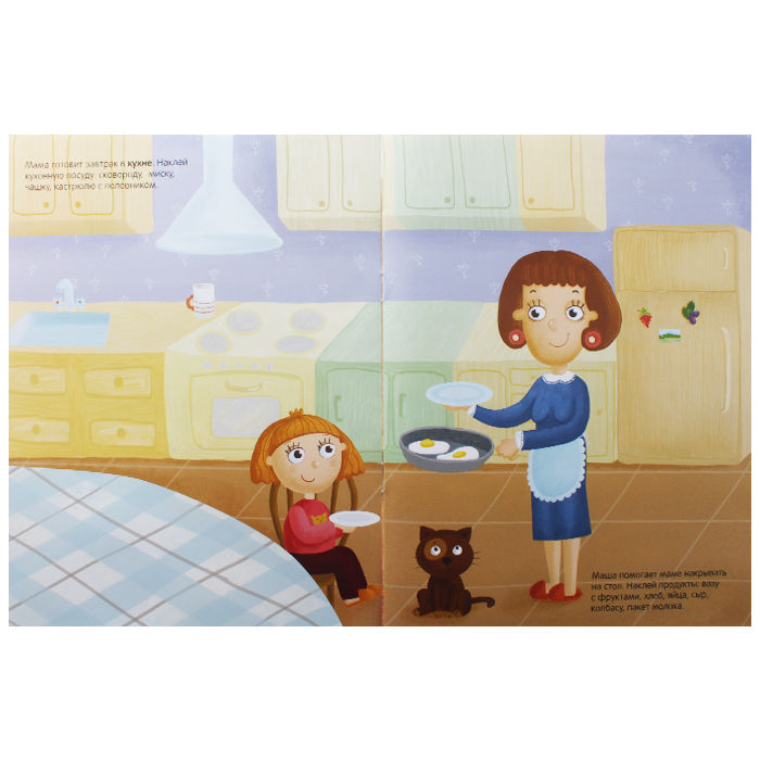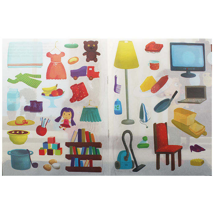 Приклеивая яркие наклейки в нужное место, ваш малыш побывает в доме – в кухне, прихожей, ванной и других комнатах, познакомится с такими понятиями как посуда, одежда, обувь и мебель.