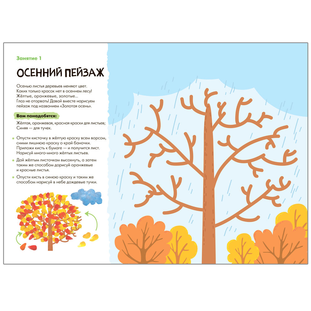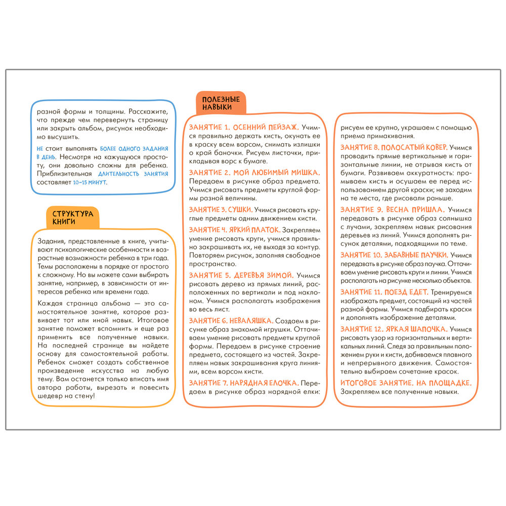 Результатом каждого занятия станет законченное произведение, которое ребенок создал сам. В конце альбома юного художника ждет большое итоговое задание, где он сможет применить все свои новые умения. Подходящий уровень сложности и полученное удовольствие от занятий – вот залог успешного обучения по системе.