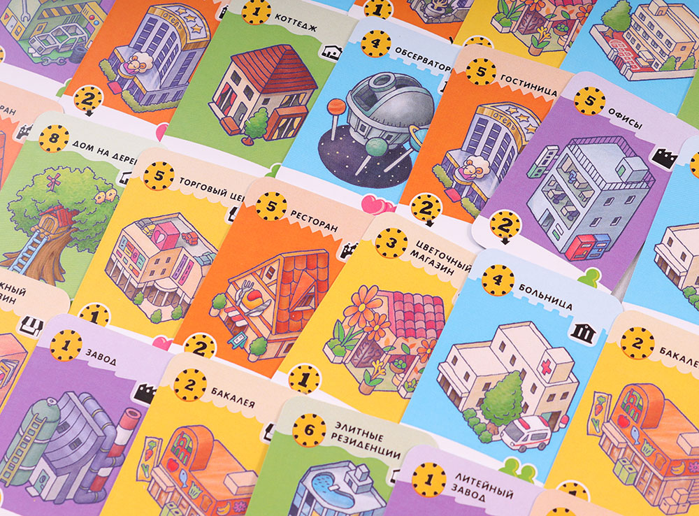 В состав настольной игры Город счастья входит: 30 монет; 140 карточек; 1 памятка дохода; 66 зданий; 5 счастливых рынков; 12 жилых зданий; 56 особых зданий; правила игры.