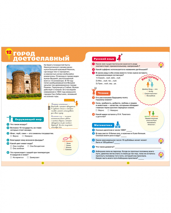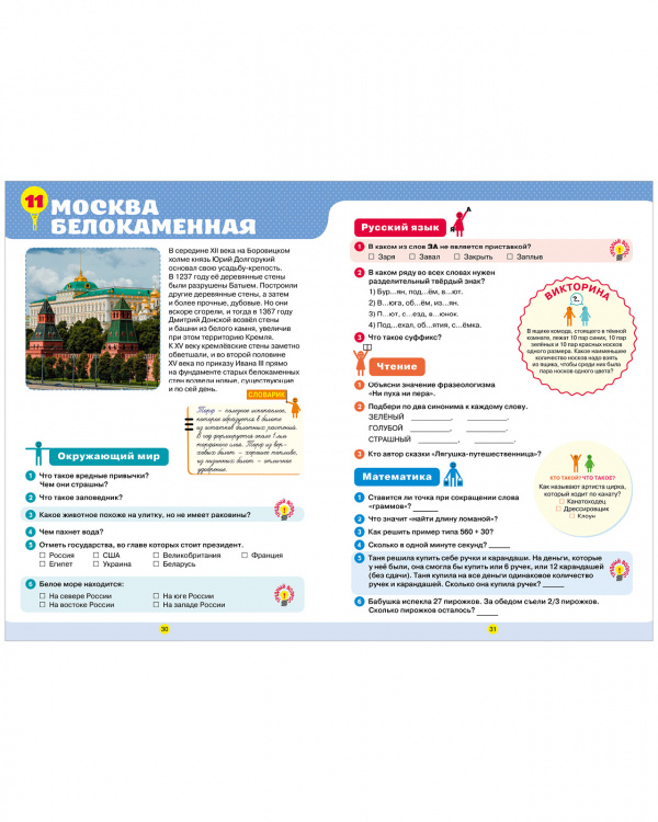 В книге есть все, чтобы третьеклассник заполнил пробелы в знаниях, повторил пройденное, расширил кругозор и подготовился к олимпиадам и контрольным. Страницы-помощники подскажут основные правила по русскому языку, математике и важные понятия по окружающему миру. А тестовые задания и интеллектуальные врезки «Викторина», «Кто лишний? Что лишнее?», «Кто такой? Что такое?», «Верно/Неверно» потренируют сообразительность, память и логическое мышление ребенка.