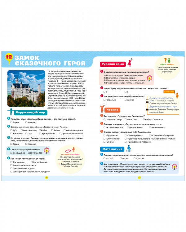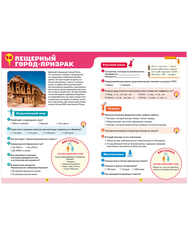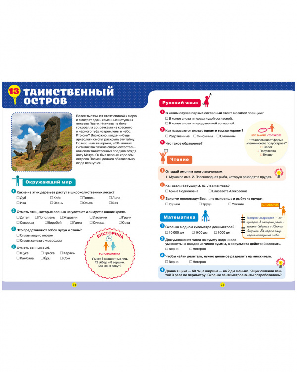 В книге есть все, чтобы четвероклассник заполнил пробелы в знаниях, повторил пройденное, расширил кругозор и подготовился к олимпиадам и контрольным. Страницы-помощники подскажут основные правила по русскому языку, математике и важные понятия по окружающему миру. А тестовые задания и интеллектуальные врезки «Викторина», «Кто лишний? Что лишнее?», «Кто такой? Что такое?», «Верно/Неверно» потренируют сообразительность, память и логическое мышление ребенка.