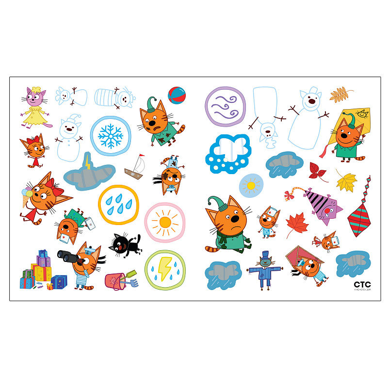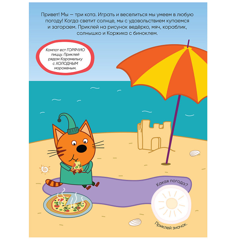 Благодаря удобному формату заниматься по книге “Погода” из серии “Три кота. Развивающие наклейки” можно где угодно: дома, в поездке, гостях и на прогулке.