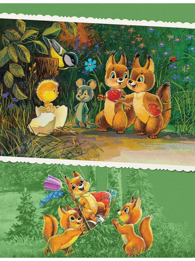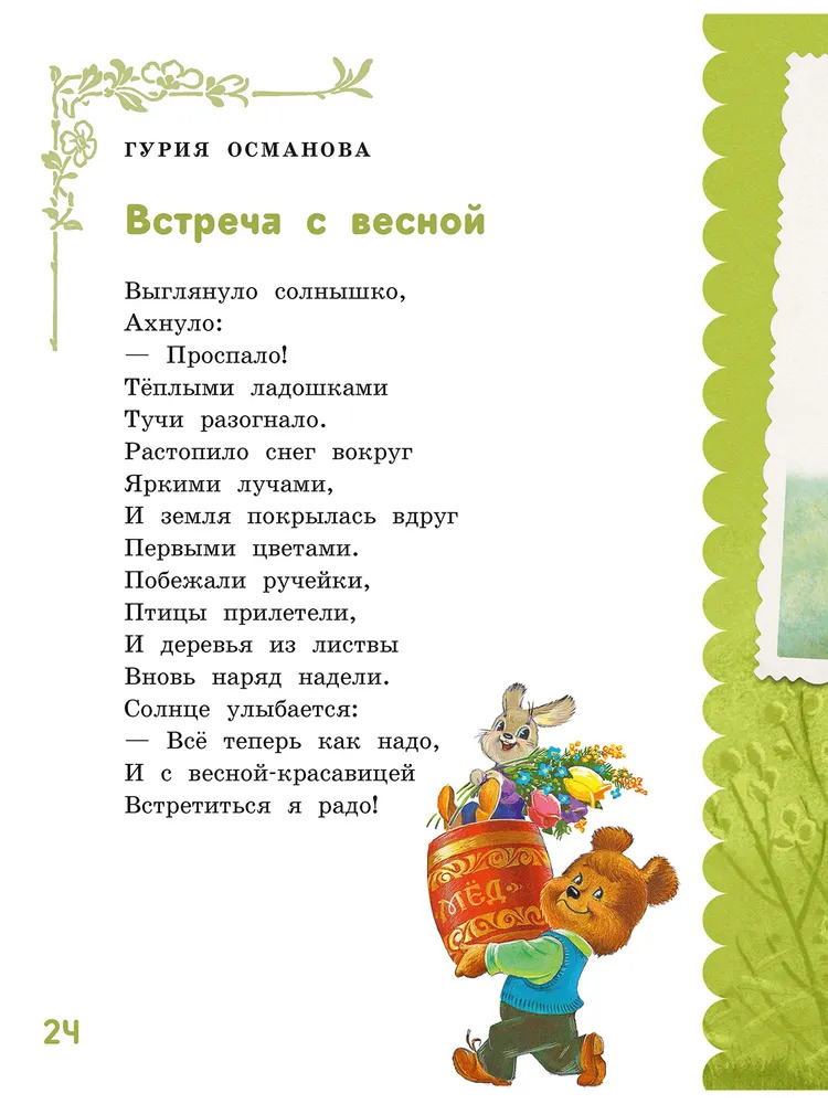 На страницах этой книги можно промчаться вдоль заснеженной опушки на коньках и скатиться с горки на санках, сложить солнышко с дождем и отметить праздник мам, отправиться в путешествие по утреннему саду и получить в подарок радугу, побывать на сборе урожая и пошуршать листьями на разноцветных ковровых дорожках. Всё потому, что здесь встретились все четыре времени года – в веселых, звонких и любимых строчках детских стихов! Озорным и запоминающимся рифмам вторят самые добрые на свете рисунки Владимира Зарубина – художника-мультипликатора, который одним взмахом кисти переносит нас в беззаботную пору детства.