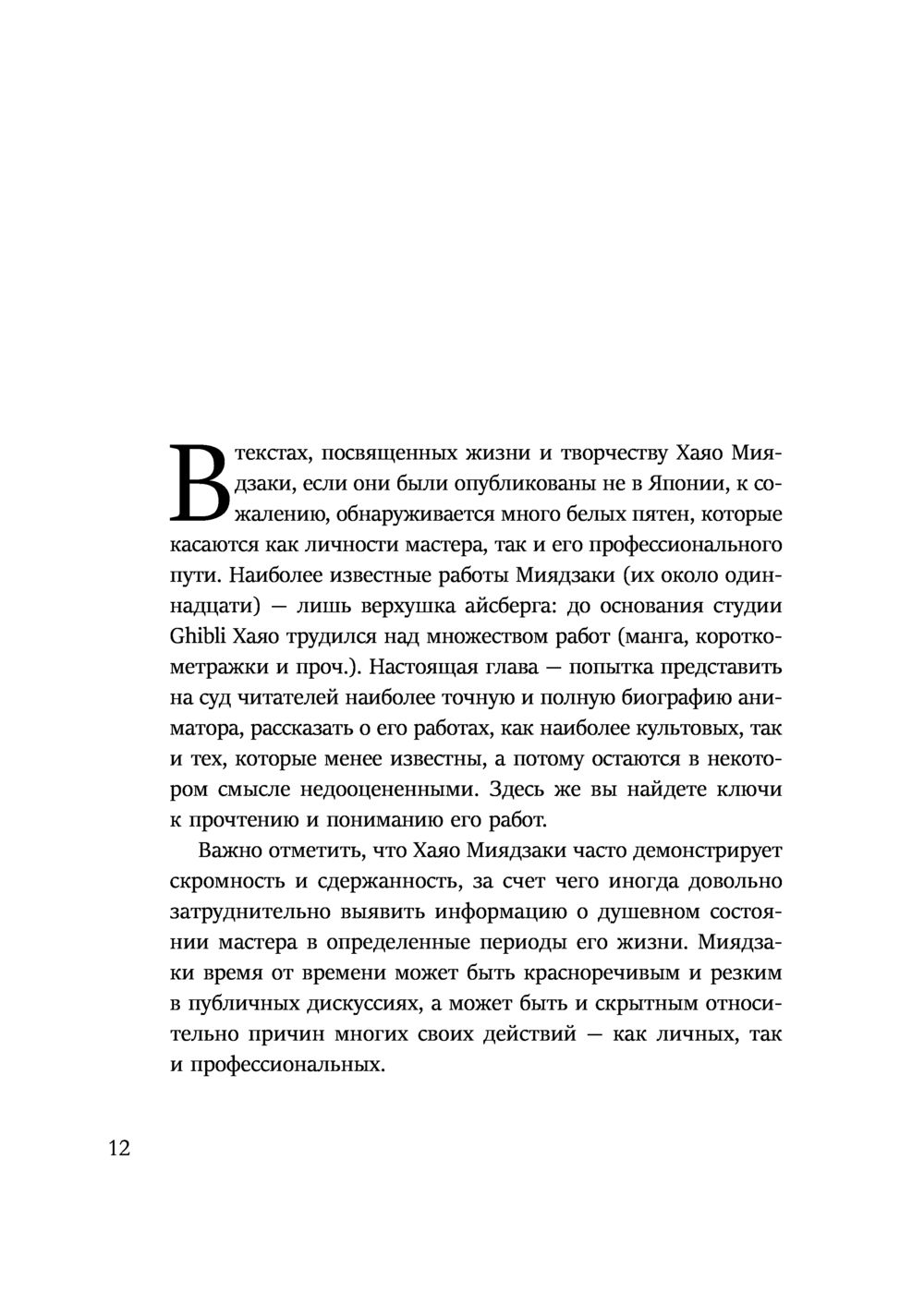 Хаяо Миядзаки сумел дотянуться до каждого из нас. Для этого ему понадобилось немногое – всего лишь показать, что волшебство намного реальнее и ближе, чем кажется. Стиль анимации Миядзаки не перепутаешь ни с каким другим, а созданные им фильмы стали известны во всём мире: “Унесённые призраками”, “Ходячий замок”, “Ветер крепчает” и другие картины, которые мы пересматривали множество раз. Книга “Вселенная Хаяо Миядзаки. Картины великого аниматора в деталях” раскрывает все грани легендарного японского мультипликатора. Вы узнаете о том, как складывалась жизнь режиссёра с его юных лет, как создавалась студия Ghibli, где рождались жемчужины японской анимации. Вместе с автором вы взглянете на фильмы Миядзаки с другого ракурса и обнаружите те детали, которые могли ускользнуть от вашего взгляда даже спустя множество просмотров фильмов. Если вы беззаветно очарованы вселенной Хаяо Миядзаки, если вас восхищает эстетика локаций и персонажей, созданных Миядзаки и его коллегами, и если вы считаете бесспорной истиной, что анимации японских режиссёров нет равных во всём мире, – эта книга для вас.