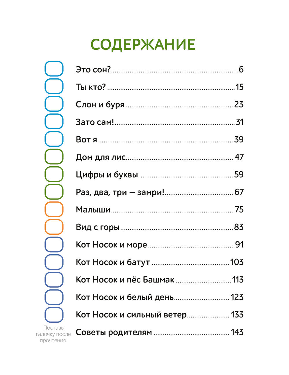 В сборник вошли рассказы: “Это сон?”, “Ты кто?”, “Слон и буря”, “Зато сам!”, “Вот я”, “Дом для лис”, “Цифры и буквы”, “Раз, два, три – замри!”, “Малыши”, “Вид с горы”, “Кот Носок и море”, “Кот Носок и батут”, “Кот Носок и пёс Башмак”, “Кот Носок и белый день”, “Кот Носок и сильный ветер”.