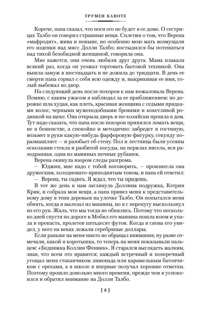 В данный том входят и “Завтрак у Тиффани” (самое знаменитое произведение Капоте, прославленное в 1961 году экранизацией с Одри Хепберн в главной роли), и лирическая повесть “Голоса травы”, и монументальный роман “Хладнокровное убийство”, основанный на истории реального преступления и породивший новый жанр “романа-репортажа”, и полное собрание рассказов этого выдающегося мастера американской литературы XX века.